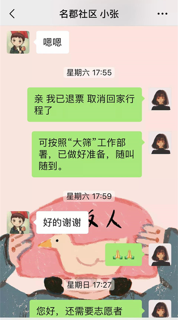 由于社区处于管控状态,居民不可随意出入,很多居民家中存粮不足,有些老人有慢性病需采买药品,有些婴儿奶粉不足,但社区人员有限,韩琳便担任起了社区联络员。接听居民求助电话,解决急、难问题,向居民发布社区消息,是韩琳间歇休息时的主要工作。在社区微信群里,业主们也自发互助,其中有一户是装修新房被隔离在此,大家知道后,纷纷捐床、捐锅、捐菜,帮助他们解决实际困难。