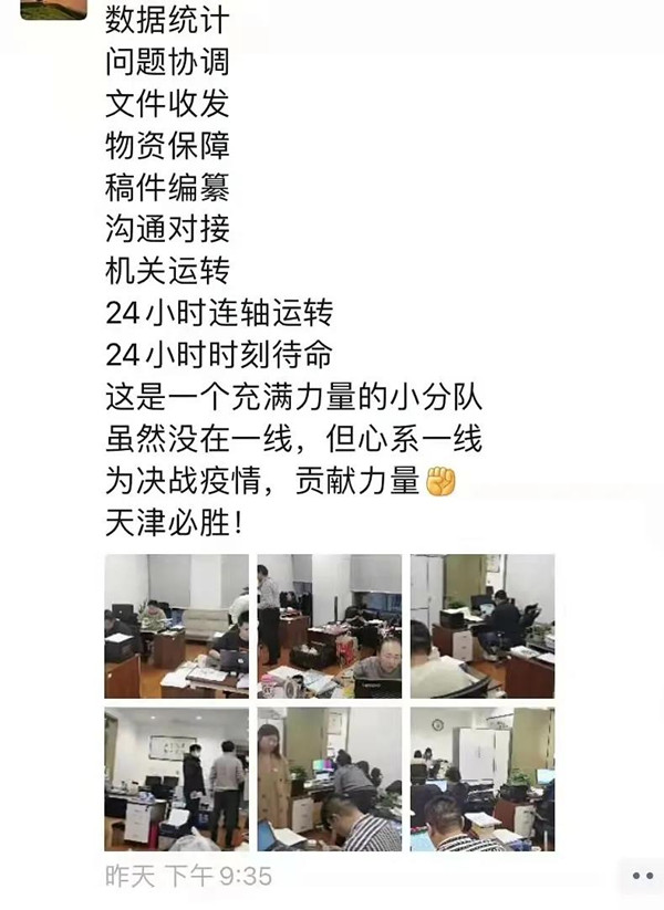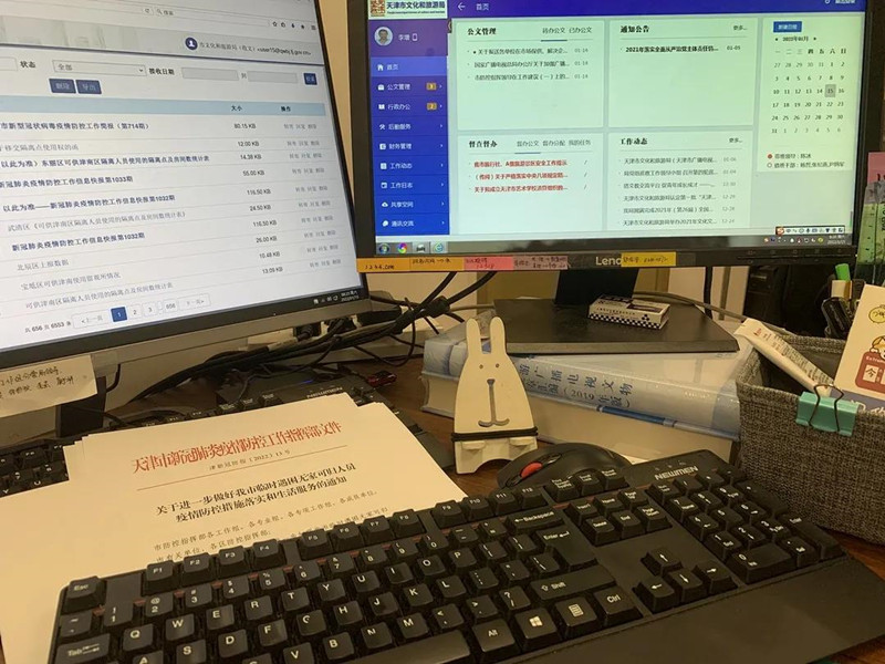 1月16日凌晨4点,市防控指挥部下达各组撤回的通知,紧张的调度结束了……为了早日实现“社会面清零”,李增在内的工作组夜以继日,开启了24小时连轴运转,随时待命的状态。取消周末,平均每日在岗不少于12小时,她明白,关键时期守好自己的岗,就是为抗疫的胜利打基础!看着身边的同事积极响应号召纷纷驰援津南或是下沉社区,她既为他们担心,又为他们骄傲。而她也深知自己的工作虽琐碎,但却不能有一点延误,“我的任务就是守好这几部电脑和一部电话,保证系统正常运行,做好上传下达工作,不错过任何一份文件,让紧急通知第一时间传达到位,为奔赴一线的同事守好大后方!”