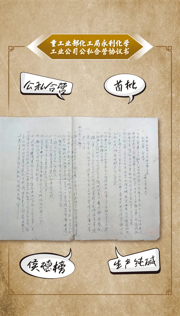 “1917年,永利化学工业公司在天津塘沽创办。化学家侯德榜在此研制出制碱领域的先进技术——‘侯氏制碱法’,打破了优质纯碱制造技术被西方垄断的局面。截至1937年,这家公司一直是中国最大且最完备的制碱工厂。1950年,永利公司申请公私合营,以解决经营的根本困难。1952年6月,我见证了永利公司成为新中国首批公私合营的大型企业。”