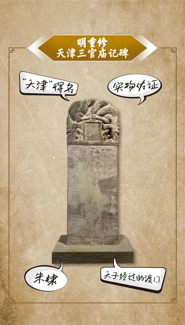 明重修天津三官庙记碑出土于天津市南开区南门外大街,现藏于天津博物馆。碑文记载:“天津小直沽之地,古斥卤之区也。我朝成祖文皇帝,入靖内难,圣驾尝由此渡沧州,因赐名曰天津,筑城凿池,而三卫所立焉。”在这块1550年(明嘉靖二十九年)刻的重修天津三官庙记碑上,详细记载了天津的赐名、筑城与设卫的历史,后被称为重修天津三官庙记碑。这一发现为“天津”得名提供了确凿的实物证据。自此,天津的历史翻开了新的一页,进入了城市时代。