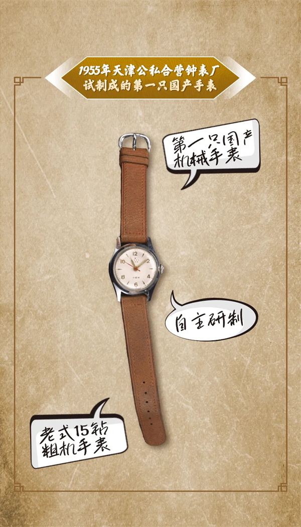 1955年天津公私合营钟表厂试制成的第一只国产手表现藏于天津博物馆。此表金属外壳,圆形表盘直径3厘米,表盘中心偏上镀有5颗星和“15钻”字样,中心偏下镀有“中国制”3个字,桔红色皮制表带。这块手表是中国第一块国产机械手表,它的诞生填补了新中国工业建设的又一项空白,也标志着我国手表工业的开端。
