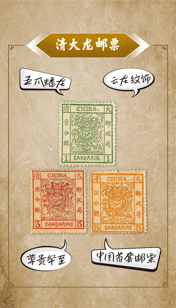 清大龙邮票现藏于中国邮政邮票博物馆,是中国发行的第一套邮票,在邮票发行史上具有重要意义。大龙邮票又称为海关大龙邮票,1套3枚,图案为江山云龙——正中为一条五爪蟠龙,腾云驾雾,煞是威严;龙上方有云,下有水,水中有石;龙首下方有一火焰珠。邮票中文铭记为“大清邮政局”,英文为“CHINA”,面值以中国海关记账单位关平银表示,分为“一分银”(绿色,寄印刷品邮资),“三分银”(红色,寄普通信函邮资),“五分银”(橘黄色,寄挂号邮资)。作为中国邮票的鼻祖,大龙邮票独特且稀缺,是中国邮票一百多年发展史上的瑰宝。