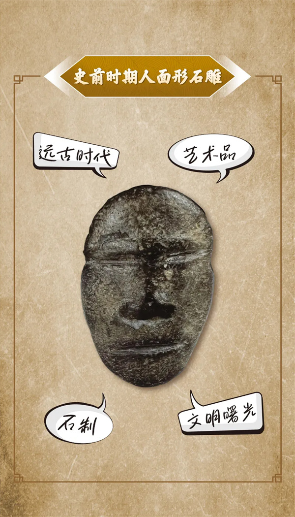 史前时期人面形石雕是一枚出土于新石器时代青池遗址的小型石制艺术品,现藏于天津博物馆。这枚小小的石雕是目前已知天津地区诞生的第一件艺术品,意味着彼时的天津人已经在生存必需之外,寻求那一缕艺术和美的曙光。