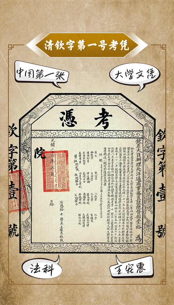 “英文、几何学、天文学、律法总论、万国公法、商务律例……这些,都是法科毕业生王宠惠学过的课程。他在天津大学的前身北洋大学堂,修满我身上所列的二十门科目后,拿到了我——中国第一张大学文凭。这些大学课程既有法律,又涉及自然科学,当时的通识教育思想,已足令今人惊叹。”