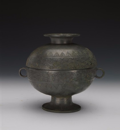 战国 二级 口径17.4厘米 高18.9厘米 器高12.7厘米 盖高7.9厘米 盖与豆盘扣合呈扁球形,盖上有类似喇叭形的圆形捉手,可倒置以盛物。豆盘两侧置环形耳,下承短柄圈足。捉手内一周三角云纹。口沿处与盘身饰有三角云纹与菱形几何纹,圈足上...