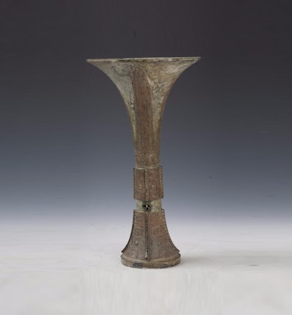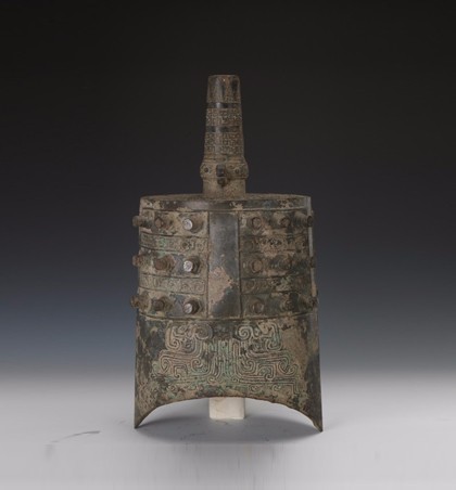 商(公元前1600-前1046) 通高47.5厘米 铙作为一种乐器名,始见于《周礼》,其书《地官鼓人》曰:“以金镯节鼓,以金铙止鼓。”郑玄注:“铙如铃,无舌,有秉,执而鸣之,以止击鼓。”铙形制像铃,但无舌而有中空之柄,属手执敲击...