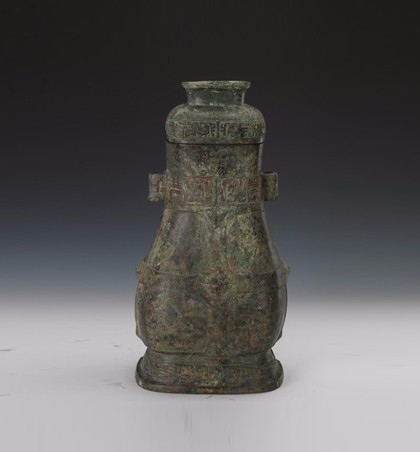 西周 一级 高44.6厘米 口径14.5厘米 此壶为长颈椭方形,壶盖较高,盖顶作圈足状,盖腹壁直深,倒置可做杯用。颈部有双贯耳,下腹部垂大,圈足高而外撇。壶通体饰有纹饰,盖口沿、颈部均饰有凤鸟纹饰带,腹部饰以十字界栏,将器腹外分...