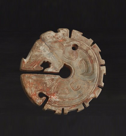 商(公元前1600-前1046年) 直径4.6厘米 厚0.6厘米 灰青色玉质,器的表面有朱砂。上唇勾翘,张口露齿,“臣”字眼形,角紧贴颈项,边缘出脊齿。纹饰完全用阴线刻双钩技法,刀法刚劲,属商代晚期的玉龙精品之作。 商代玉器表面常有...