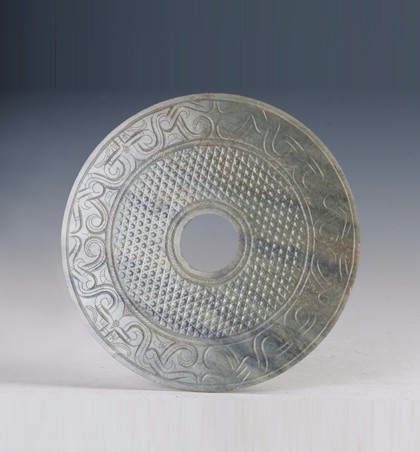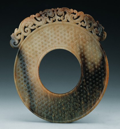汉(公元前206-公元220年) 高15.7厘米 直径13.9厘米 厚4厘米 玉质呈青色,多处有黑褐色沁斑。出廓部采用镂雕技法,双螭螭首相对,伏于璧上,中间以一尖状物相隔。螭圆眼、耷耳、独角,身以细阴线雕琢的圆圈纹及毛纹饰鳞毛,螭身造型卷...