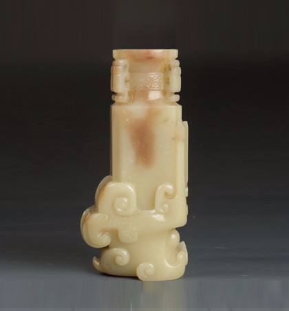 清乾隆(1736—1795) 高18.5厘米 宽9.1厘米 口径5.3厘米 清朝制玉在继承明代玉器的基础上,有极好的发展和创新,特别是乾隆时期玉器制作已成鼎盛之势。清代玉器选材广泛,除用白玉、青玉、黄玉、碧玉、墨玉外,兼用翡翠、玛瑙、水晶、...