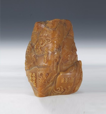 清(1644-1911) 高11厘米 宽8厘米 该章高11厘米,宽8厘米,为私印,石质纯净细润。该南山之寿寿山石章章体随形而刻,浮雕、浅浮雕技巧并用,雕刻有仙山楼阁、祥云、灵芝、仙鹤、神道人物等祥瑞图案,工艺高超,并在章身刻“紫气东...