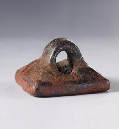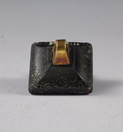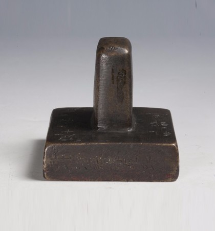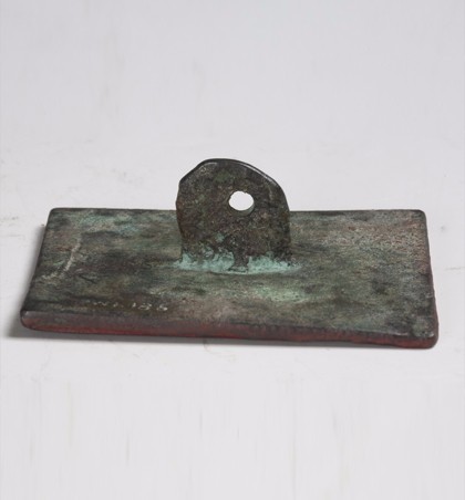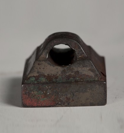 五代(907-960) 长6厘米 宽4.8厘米 高2.3厘米 长方形,背铸鼻钮,钮顶呈半圆形,片状。体轻且薄,通体褐色,间有绿锈斑。印文为窄边朱文楷书两行六字“元从都押衙记”。“元从”始于唐高祖的“元从禁军”,凡被授予者,皆享有一定...