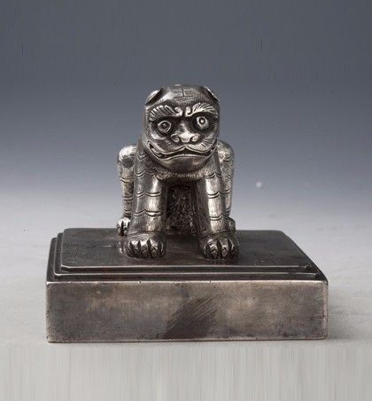 清宣统(1909-1911) 长12.7厘米 宽12.7厘米 高10厘米 银质,钮为一蹲曲的龙形,龙体刻画精细,龙形威武庄严。印面呈正方形,镌阳文满、汉两种文体的篆书“祺皇贵太妃之宝”七字。龙钮印是尊贵的象征,只有皇亲国戚才能使用,此印即...
