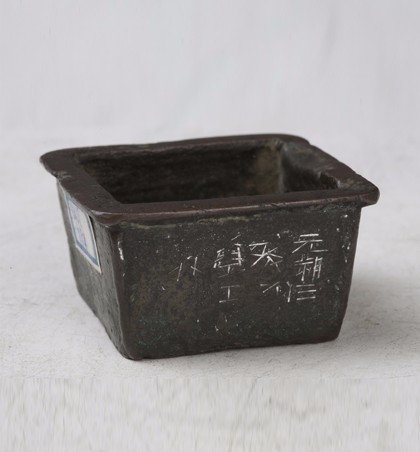 西汉元朔三年(公元前126年) 长5.2厘米 宽5厘米 高2.7厘米 正方形,侈口,抹角。内底中间有一桥钮印形凸出体,旁有一个半漏斗形凸出体与之连接。外侧左、右壁凿铭文八行十五字“元朔三年叔坚工仆,上郡工褒夫立戊”,外底凹凸不平...