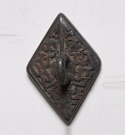 春秋(公元前770-前476年) 长4.8厘米 宽3.3厘米 高1.9厘米 铜质,鼻钮,钮上有绳纹,印背铸有对称的蟠虺纹。印面呈菱形,被二条凸起的交叉直线分成四格,格内铸阳文“壬兵戎器”四字反文。文意是:军旅所用兵器。可能是在军中发放...