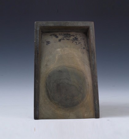 宋(960-1279) 长23.5厘米 宽15.5厘米 高3.7厘米 砚作长方形抄手式,石质细润,呈黄绿色,砚面隐现圈状木纹,造型端庄,具有典型的宋代特征。砚背刻有郑孝胥铭:“北宋洮河产研。孝胥”,历史、艺术价值极高。 Scribe-style inks...