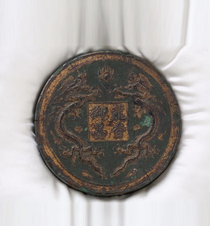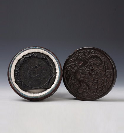 明隆庆(1567-1572) 直径8.7厘米 高1.7厘米 圆形绿色彩墨,一面有描金双龙戏珠图案,中间楷书“龙香御墨”,背面阴刻“大明隆庆年制”楷书款。 《涉园墨萃》中“中舟藏录”(袁励准)著录赭彩墨两件,其中一件形式、尺寸与此墨完...