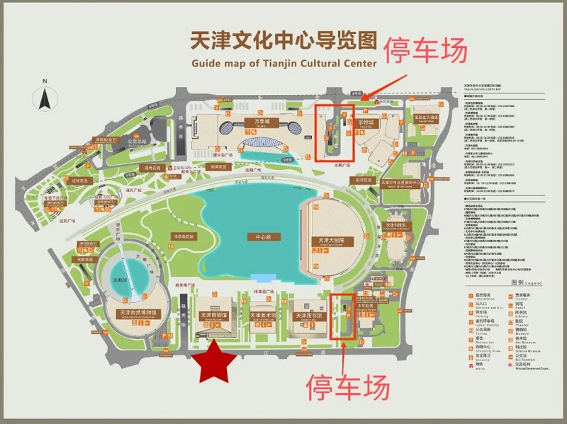 1.文化中心东侧停车场(位于中华剧院与天津图书馆之间),步行400米即到。