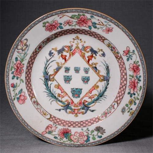纹章瓷是外销瓷中的一个特殊种类,始于16世纪,于18世纪达到顶峰,因器物表面直接绘有家族徽章图案而得名,是由中国工匠按照欧美订购商所提供的品种、造型、纹饰图案进行彩绘烧制而成,属于“来样加工”的定制瓷器。与普通的贸易外销瓷不同,纹章瓷是为具有特殊身份的皇室成员、政府官员、神职人员、豪绅贵族、特殊协会或公司所定制的,制作上最为精美,在当时欧美属于顶级奢侈品,可算上外销瓷中的“官窑”。纹章瓷既有中国传统制瓷工艺的特点,又能直接反映出当时欧美上层阶级的审美喜好,是海上丝绸之路及中外文化交流融合的重要物证。由于种种原因,我国虽然是纹章瓷的烧制国,但国内纹章瓷的遗存量却较少。该批纹章瓷自海外回归入藏天津博物馆,不仅填补了馆藏空白,使天博本就丰富的瓷器收藏更加系统、完整,更为我馆开展中西文化交流研究及策划举办“一带一路”相关展览奠定了坚实的物质基础。
