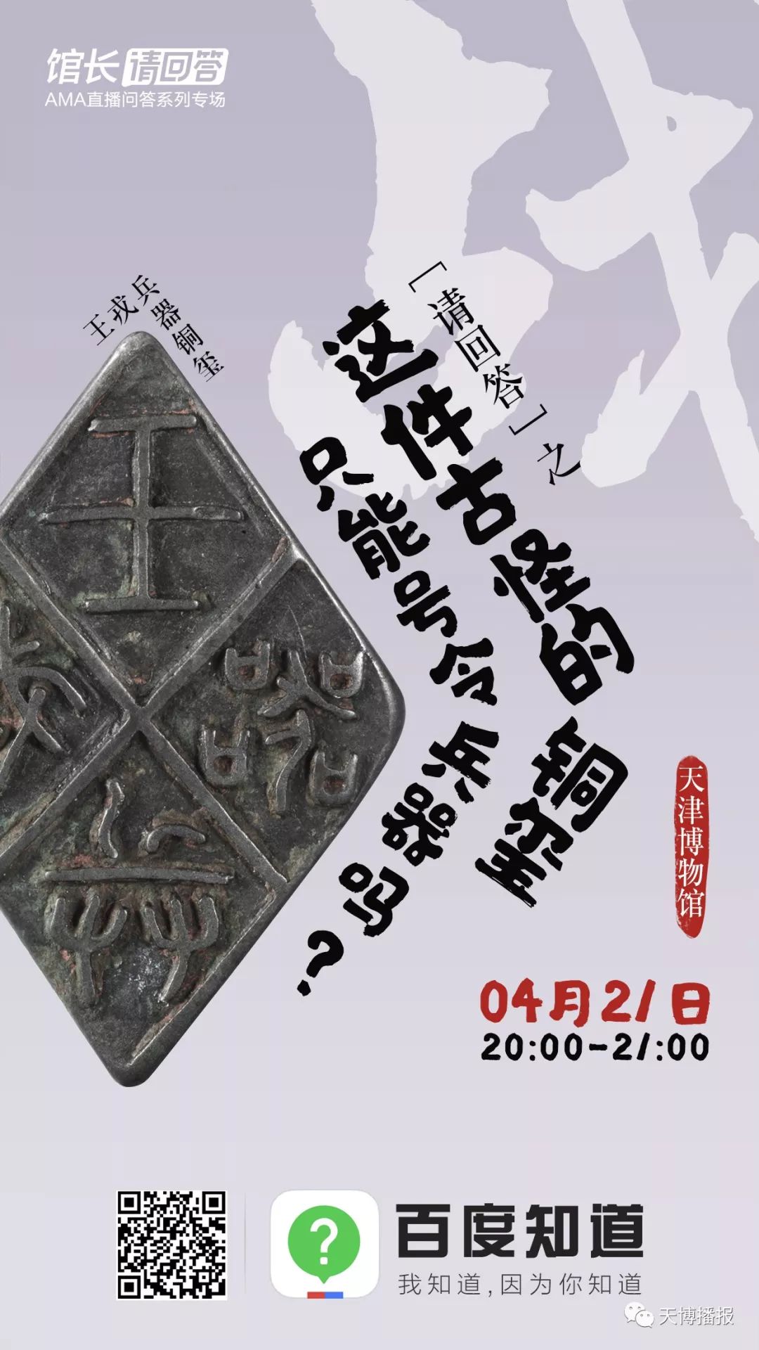 4月21日20:00-21:00,天津博物馆副馆长钱玲、器物研究部副研究馆员李君与国际企业高管、消费科技行业数据专家周啓群先生做客百度知道《馆长请回答》栏目直播间,为观众们讲述天津博物馆馆藏精品文物——王戎兵器铜玺背后的故事。