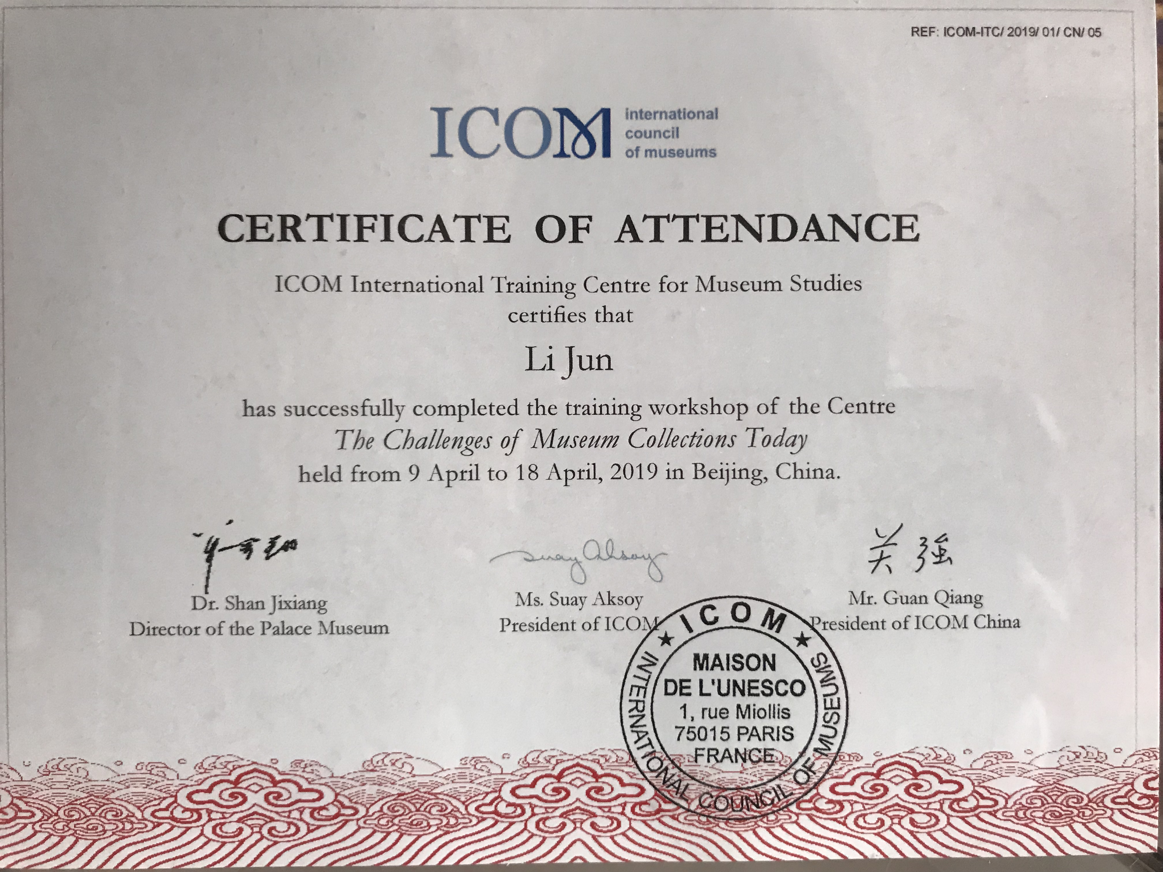 2019年4月9日至18日,国际博协培训中心2019年春季培训班成功举办。天津博物馆器物研究部李君通过考试,参加了此次培训班。该培训班是国际博协培训中心在北京举办的第十二期常规培训班,历时10天,共招收28名学员。其中,中国学员12名,来自国内10省市12家机构;国际学员16名,来自亚非欧拉15个国家,其中俄罗斯和比利时首次派员参加培训。