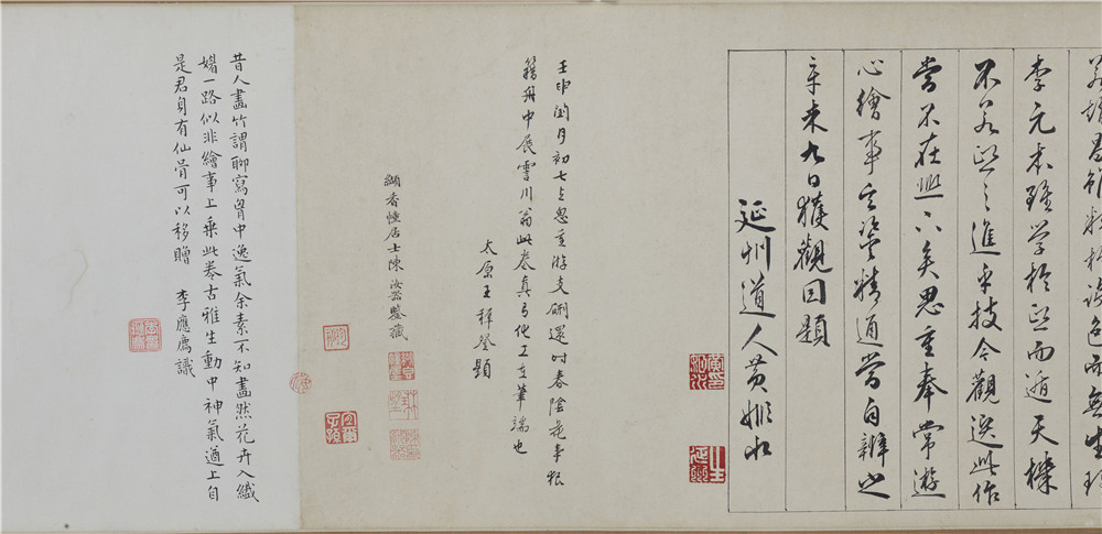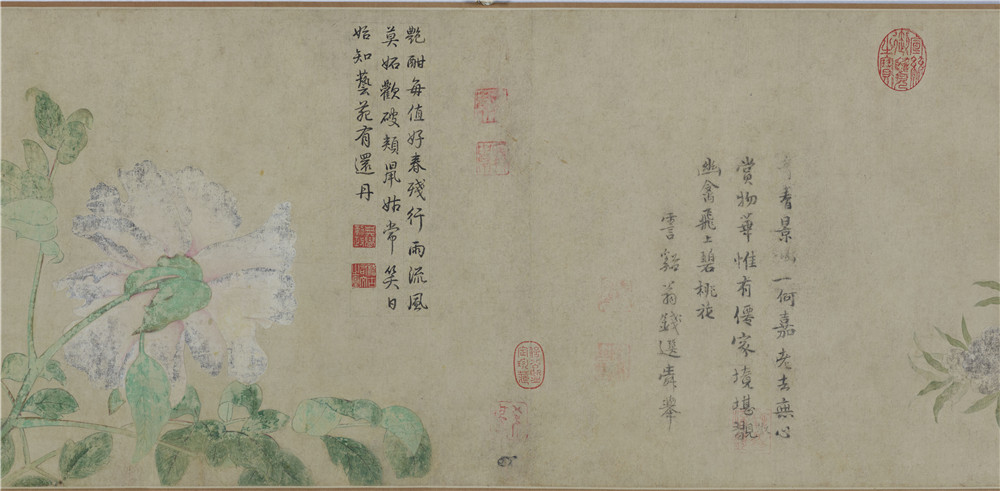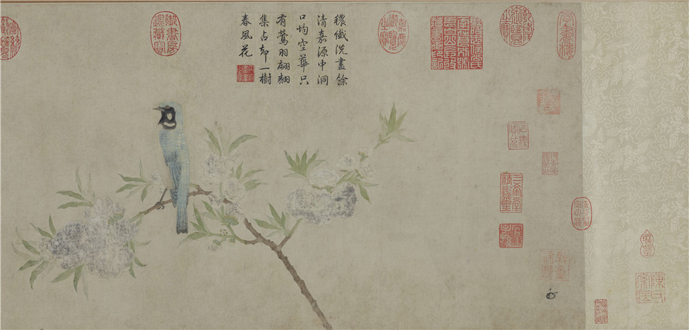 天津博物馆藏元代钱选《花鸟图卷》参加了此次展览,且是该展览唯一外借的展品。钱选是元代早期重要画家,工诗文,善书画,在山水、人物及花鸟画领域均取得了突出的成就。他的花鸟画擅于捕捉自然界花卉禽鸟最生动的情形,形态逼真而不失情趣。此件《花鸟图卷》分三段绘了桃花翠鸟、牡丹、梅花,每段画均配有作者自题诗一首。诗意与画意相辅相成,所绘形象准确,神态生动,笔力挺健,是钱选花鸟画至精之作。
