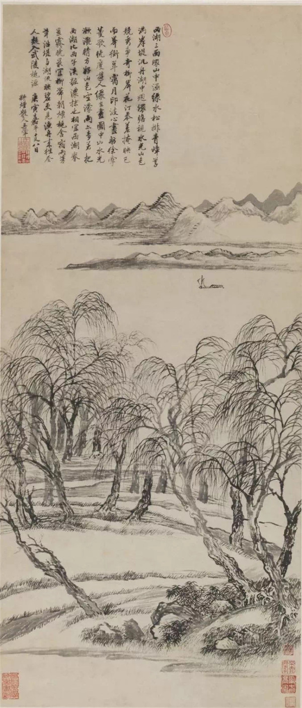此图绘西湖美景,以平远构图,展现江南山水丘壑。近景坡岸水渚,垂柳成行,枝干参差,各具形态。远景群山,连绵起伏,湖上有轻舟张帆而行。观此图,江南春风似扑面而来。
