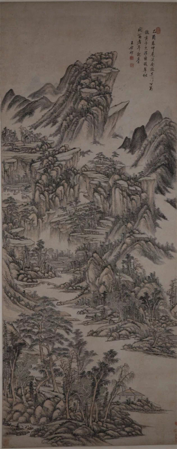 《浮峦暖翠图》是黄公望名作。董其昌、王时敏、王鑑等人均有临作。此图结构严谨,山石左右交错而上,水流迂曲,山腰云霭浮动,树木葱郁。颇得黄公望“山头要折搭转换,山脉皆顺,此活法也”的构图要领。笔墨亦以黄公望为宗,干笔反复皴擦,浓墨点染,使山体厚重苍浑的同时又有蓬勃生气。款署:“乙酉春仲,扈从南旋吴门公寓仿黄子久浮峦暖翠,似开翁老年亲台。王原祁。”