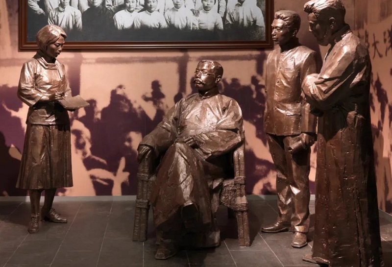 走进天津博物馆三楼“中华百年看天津”展厅,一组铜像十分引人注目,这是李大钊到天津演讲时的场景。李大钊是中国共产党创始人之一,是中国第一个举起马克思主义大旗的人。