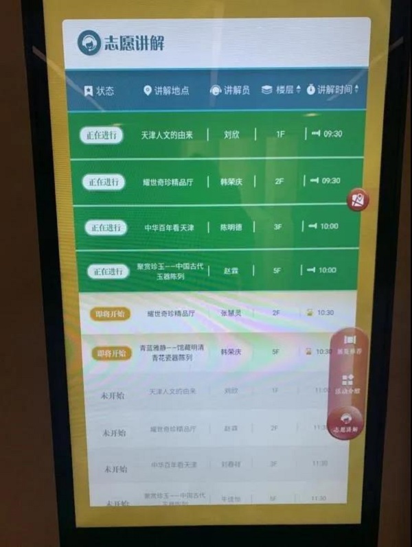 为了进一步提升服务质量,方便观众了解志愿者讲解场次信息,宣教部在信息部的大力协助下,于馆内公共空间的电子导览屏上增加了预告志愿者讲解信息这一功能。这一功能假期上线后,受到了观众的点赞好评,纷纷表示这一人性化服务非常贴心。