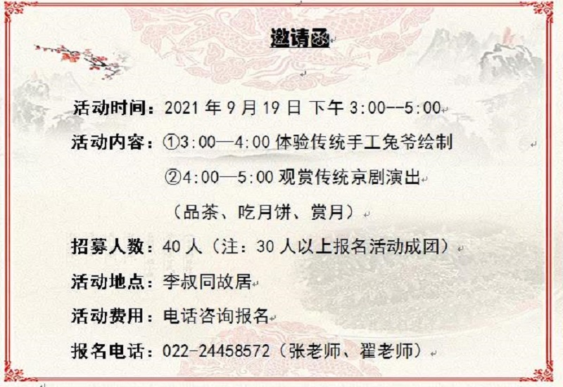 “花好月圆夜 月圆人团圆”——天津博物馆、李叔同故居邀您品茶、画兔爷、赏戏曲艺术,感受视觉、听觉、味觉三重艺术饕餮盛宴
