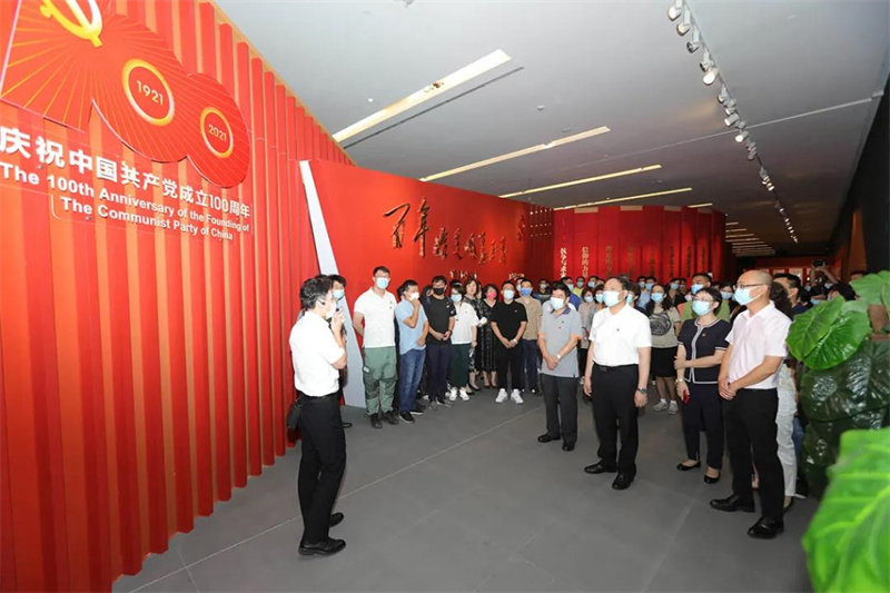 步入展厅,天博一行随即被丰富的展品和精美的展陈所吸引。一张张精彩的照片,无言地述说着中国共产党人百年来坚守初心与使命的感人故事;一段段鲜活的影像,记录着百年大党精彩的历史瞬间;一件件珍贵的文献档案,诠释着中国共产党不断取得胜利的成功密码和力量所在。天津博物馆党委书记、馆长陈卓一行在讲解员的带领下,共同回忆了中国共产党百年的奋斗历程和伟大成就,不时驻足观看,交流心得。