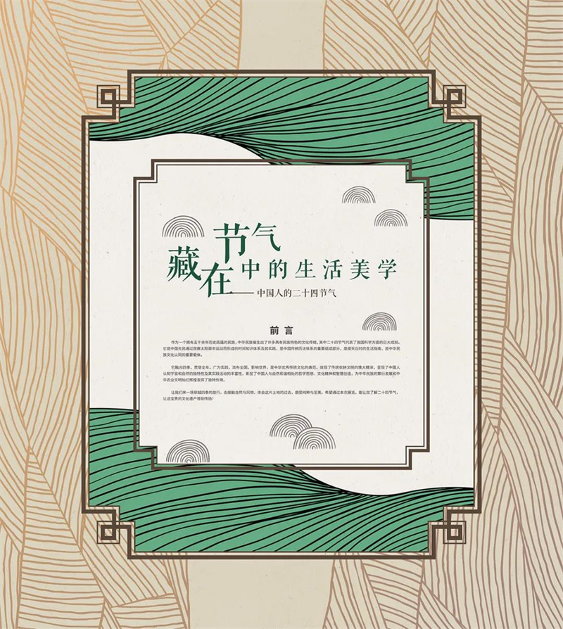本次展览以图文并茂的方式讲述二十四节气的内容,目的在于体现传统农耕文明的博大精深,呈现中国人认知宇宙和自然的独特性及其实践活动的丰富性,彰显中国人与自然和谐相处的哲学思想、文化精神和智慧创造。
