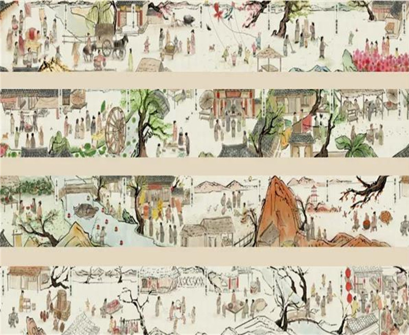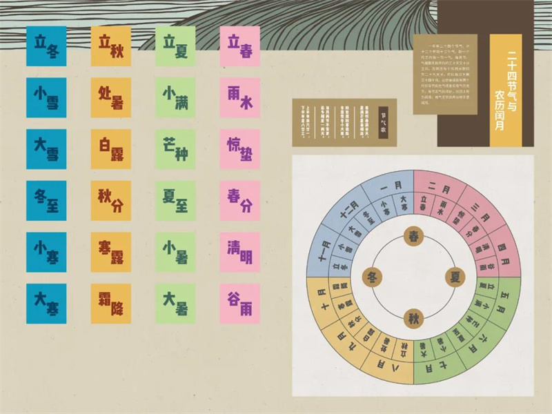 此部分的展览形式采用了手绘民俗画的方式来讲述二十四节气的传统风俗。通过“一幅展开的民俗画卷”构建出叙事空间,营造出“春夏秋冬”中不同节气光景变换,生动诠释了“二十四节气”中所蕴藏的中华优秀传统文化。