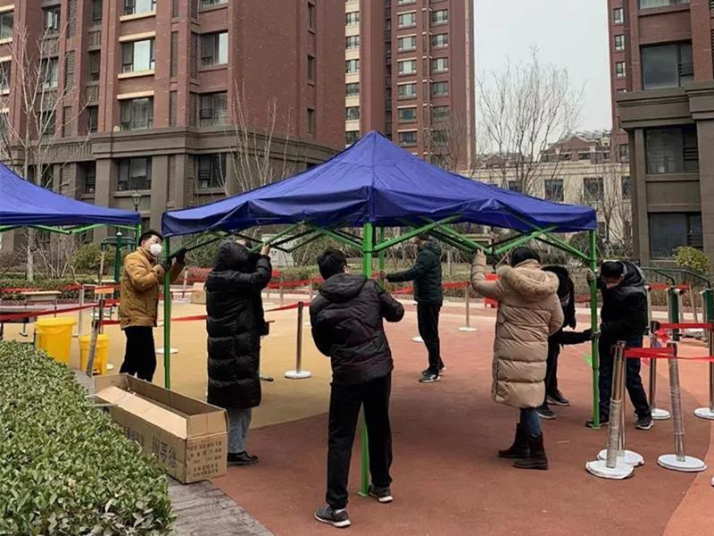 今天,核酸检测点从社区外搬到了社区里,避免大规模排队,也避免不同小区人员交叉感染。在医护人员和社区工作者的安排协调下,我们搭起了临时帐篷。
