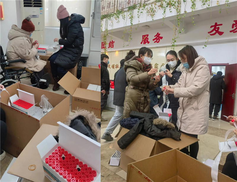 驻扎的社区绝大多数楼门改为管控区,作为封控区的7、8号楼仍然需要频繁的核酸检测,我们就承担起为大量核酸检测试管粘贴信息条码的工作。大家通力配合、迅速高效的完成了任务。