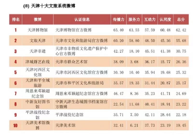 2023年新春佳节之际,天津博物馆捷报频传。“2022年度政务微博影响力报告”与“文博新媒体年度榜单”相继发布,天津博物馆微博在全国数千家博物馆中脱颖而出,位列全国十大博物馆第六位,同时荣登天津市十大文旅系统微博榜首,并连续四年蝉联年度十大影响力官微称号。