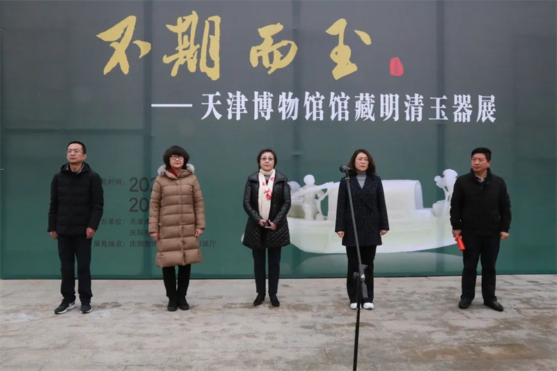 2月21日上午,迎着细细的春雪,展览开幕式如期举行。天津博物馆党委副书记张玲在开幕式上讲到“天博党委十分重视此次在庆阳的展览,委派器物研究部主任带队精心布展。天博馆藏明清玉器,题材丰富、玉质精良、形象生动、工艺精湛。希望庆阳人民通过参观,对中国玉文化有更深刻的认识,厚植爱国情怀,增强文化自信。”庆阳市文体广电旅游局副局长梁仲元在致辞中表示“此次展览,天津博物馆将一件件精美绝伦的玉器从海河之滨带到红色圣地,让老区人民领略了独特的明清玉文化,搭建起了天津市与庆阳市文化交流的桥梁。”随后,庆阳市文体广电和旅游局局长郭丽君宣布展览开幕。
