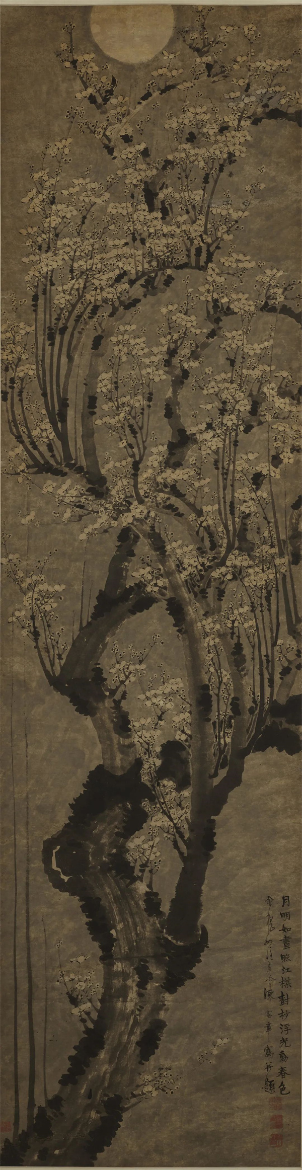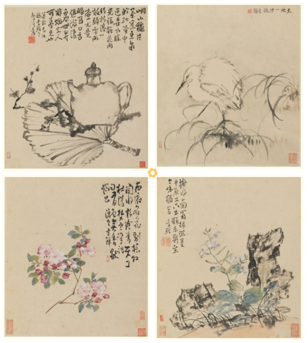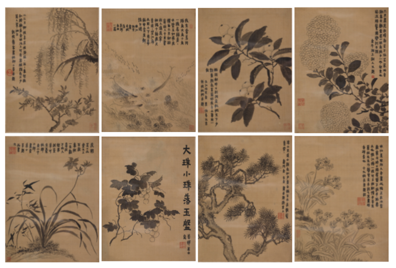 花鸟画的发展是中国绘画史中的重要组成部分。至明清两代,由于文人画理论的逐渐成熟,并体现在绘画的创作实践中,使花鸟画的发展呈现出既承元人余绪,又宗述徐、黄二体,并有发展和创新的局面,涌现出诸多优秀画家及经典作品。此次展览,天津博物馆所展出的55件套明清花鸟画藏品,囊括了明代院体画、吴门画派、金陵画派、四僧、恽派、扬州画派、海派等重要画派、重要画家的具有代表性的花鸟画作品。值得一提的是,八大山人的《河上花图》卷自2017年在馆内展出后,时隔6年赴美展出。这一长近13米花鸟画巨制,画面气势磅礴,跌宕起伏,酣畅淋漓。画面后画家以行书自题歌行体诗《河上花歌》,情感恣肆而想象丰富,书法流畅老辣,使得全卷作品成为诗、书、画、印俱佳的经典作品。