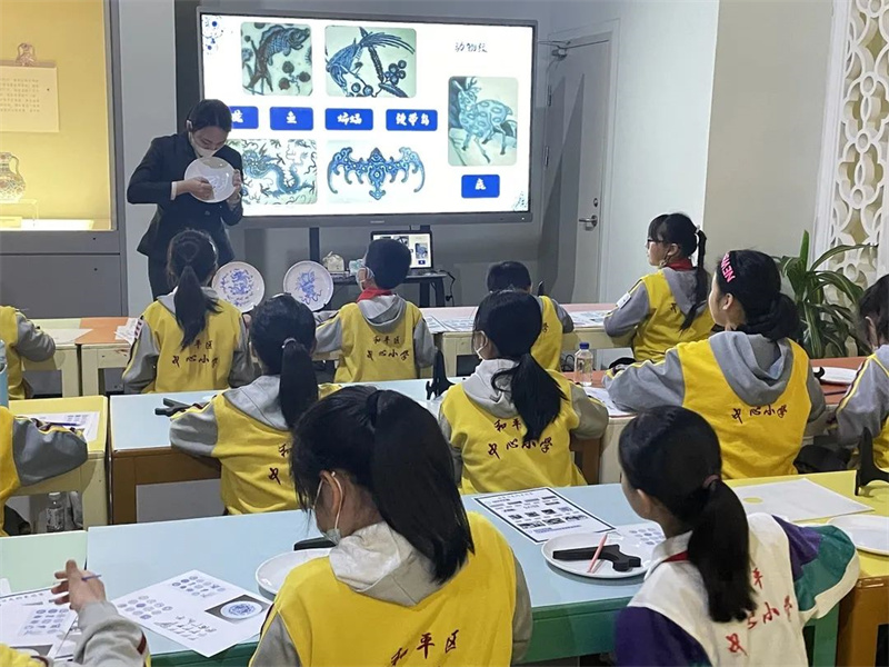 老师还以青花瓷上的“花纹”为线索,讲解了不同的青花瓷纹路,让学生们对青花瓷的历史及其纹饰有了初步的认知。