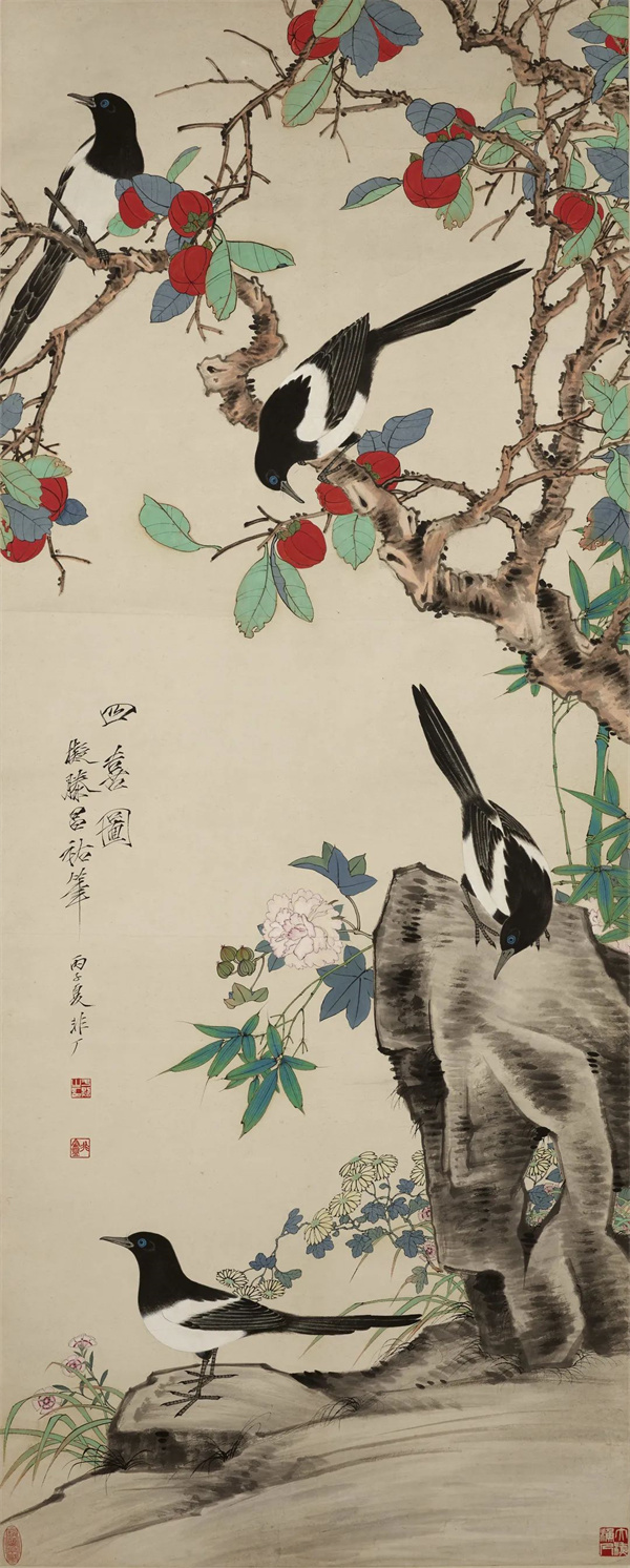 京津画坛的花鸟画,题材多样、技法丰富、风格纷呈,显示出强大的生命力。齐白石衰年变法,将文人画的笔情墨趣与民间艺术的质朴活泼相结合,创“红花墨叶”大写意花鸟画,开启现代花鸟画画风之先河,将中国花鸟画推向新的高峰。于照追法宋代工谨富丽的院体画,辅以劲健俊朗的“瘦金书”,令几近衰落的双勾重彩工笔花鸟画重焕新生。刘奎龄在传统工笔花鸟画技法基础上融合西法,并将渲染与撕毛两种技法相融合,得以将翎毛与走兽表现得更富质感。溥儒花鸟、鞍马均在继承宋人画法基础上有个人风格,工中有写,画风清逸雅静,极富情趣。