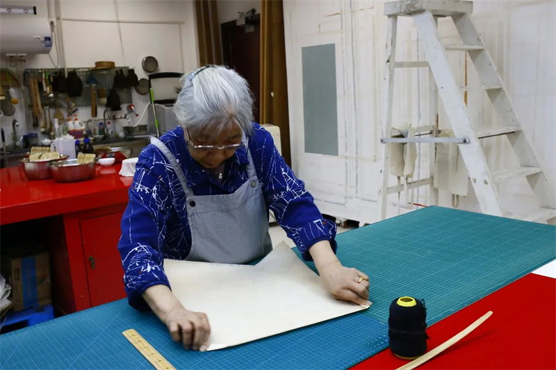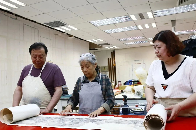 五天时间里,纪秀文老师分别就手卷文物的清洗、揭裱、备料、镶联、覆背与上墙等修复环节的实操要点进行了详尽分析和亲身演示。纪老师虽年近八旬,但是对于每一步骤的材料和工艺方面的把控不见半分松懈。她常说:“修复步骤每一步只做到9分,到最后一步可能就不及格,所以每一步都不能出错。”即使在零碎的休息时间里,纪老师还将磨马蹄刀、染虎皮宣、绷平包首以及拓片装裱修复等修复技能的要点对我馆青年的修复工作人员倾囊相授。淬砺至臻的工匠精神在纪老师言传身教中展现得淋漓尽致。