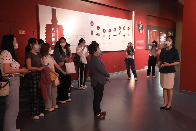 为了配合此次共建活动,宣教部不仅安排了优秀讲解员对展览进行详尽讲解,还特意邀请到“声动千年”策展人,天津博物馆器物部乔岳老师,结合展览为师生们做了专题讲座,从展览概况、内容设计、展陈设计等方面生动地讲述了策展背后的故事,并回答了同学们的提问。精彩的互动吸引着参观的师生,掌声不断。音乐学院的郇瑞、吴微坷等学生在“王孙诰编钟(复制品)”前进行笙、笛独奏表演,用特有方式“讲述”自己的“声动”体验。