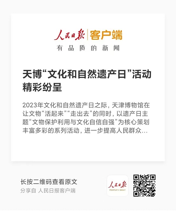 2023年6月11日,人民日报客户端天津频道推出专题报道《天博“文化和自然遗产日”活动精彩纷呈》。2023年文化和自然遗产日之际,天津博物馆在让文物“活起来”“走出去”的同时,以遗产日主题“文物保护利用与文化自信自强”为核心策划丰富多彩的系列活动,进一步提高人民群众文化遗产保护意识,传承弘扬中华优秀传统文化,营造全社会共同参与文化遗产保护传承的良好氛围,让文化遗产薪火相传,展现时代光彩。