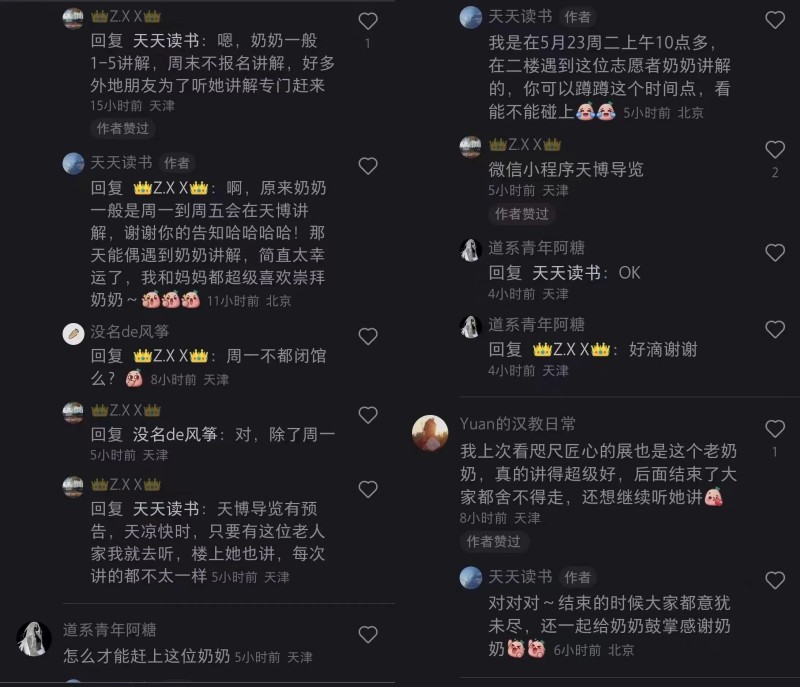 近日有热心观众在网上晒出了,自己在天博听一位满头银发,精神矍铄的志愿者“老奶奶”讲解的经历,许多网友留言对她融会贯通、声情并茂、娓娓道来的专业讲解所震撼,甚至有的网友还分享了如何找到这位老师的攻略,字字句句都流露出,对她博学多才,精彩讲解的肯定和称赞,许多网友留言说,正是因她的讲解而爱上了博物馆。如果您来天博,或许会与她不期而遇。