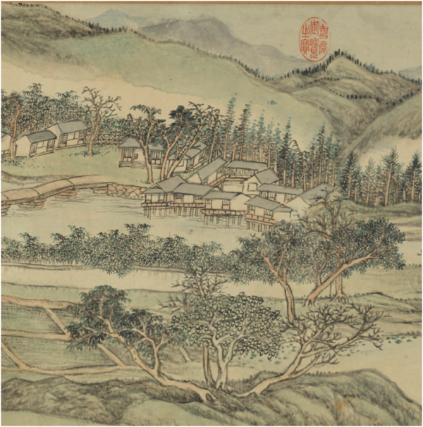 乾隆南巡时每次必游览惠山,称赞惠山为“江南第一山”。《惠山图》卷描绘了无锡惠山的秀美风光,将山峦、村舍、庭院、宝塔尽收于一卷之中,构图上前简后繁,将观者缓缓带入其中。而作者用笔疏繁有序,既表现出山麓的苍翠雄浑,又不失江南风光的灵秀。款署:“臣张宗苍恭绘”。卷中钤有乾隆内府鉴藏印数方,并在《石渠宝笈续编》中著录,可见此件作品原为清宫旧藏,现藏于天津博物馆。