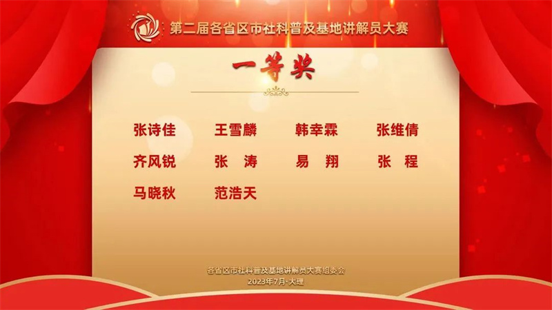 7月25日—26日,第二届各省区市社科普及基地讲解员大赛在云南大理正式开赛。来自全国28个省区市的81名社科普及基地讲解员同台竞技,天津博物馆讲解员张维倩作为天津市的代表选手,通过优异的表现荣获个人一等奖,天津博物馆荣获优秀组织奖。