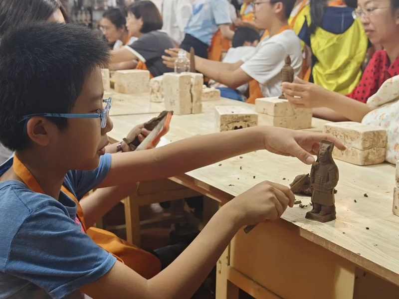 兵马俑制作——在秦陶俑制作研学基地,孩子们团泥、压按、脱模,体验着秦兵马俑的古法制作工艺,认真听认真学,团结协作,真正体验到劳动实践的乐趣。师生们由衷赞叹着,秦俑工艺真是中国古代劳动人民聪明才智的缩影。