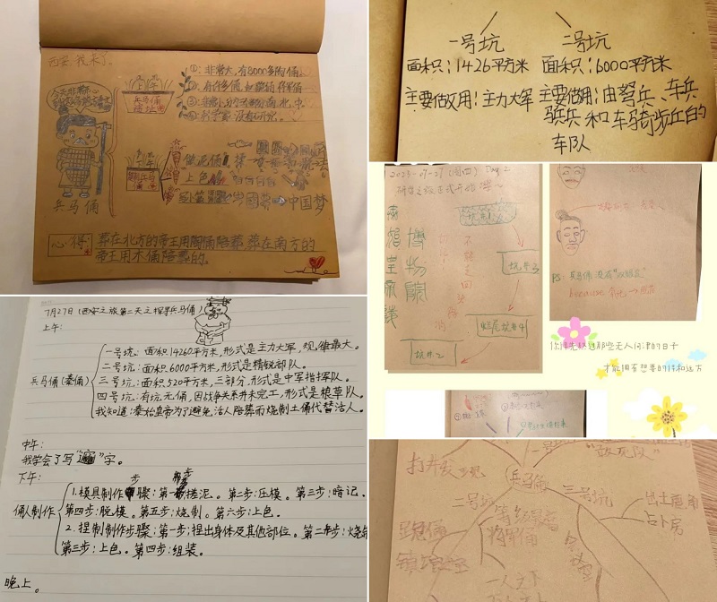 研学途中,孩子们更是边看边画,在玩中学、学中思、思中悟,让孩子获得快乐学习体验的同时,养成良好的思维习惯。孩子们用思维导图记录了在西安的所见所闻,开拓眼界的同时,也使思维显性化,进一步提升自己的总结能力,和学习能力。