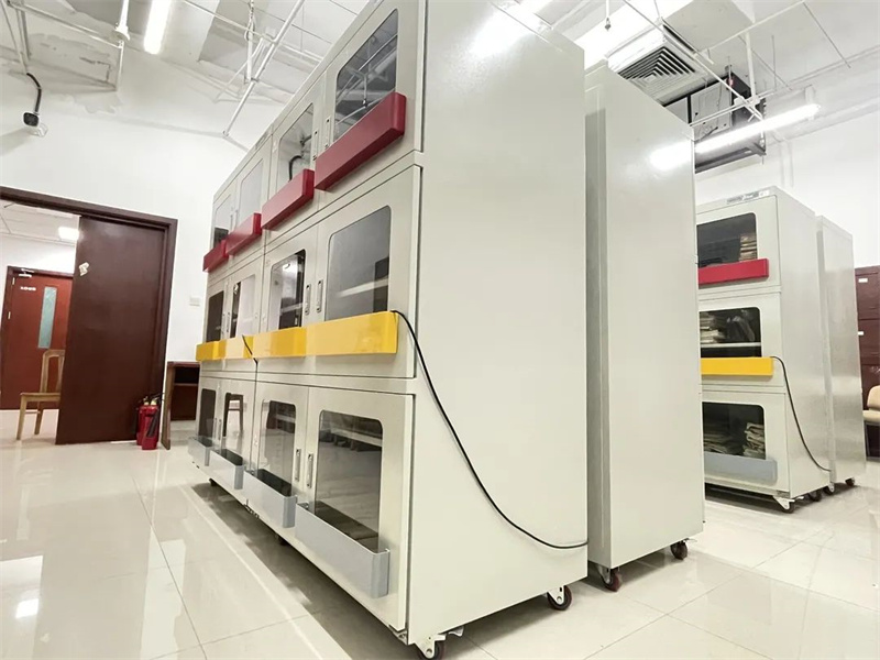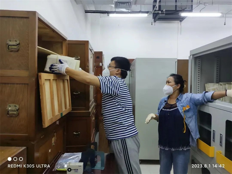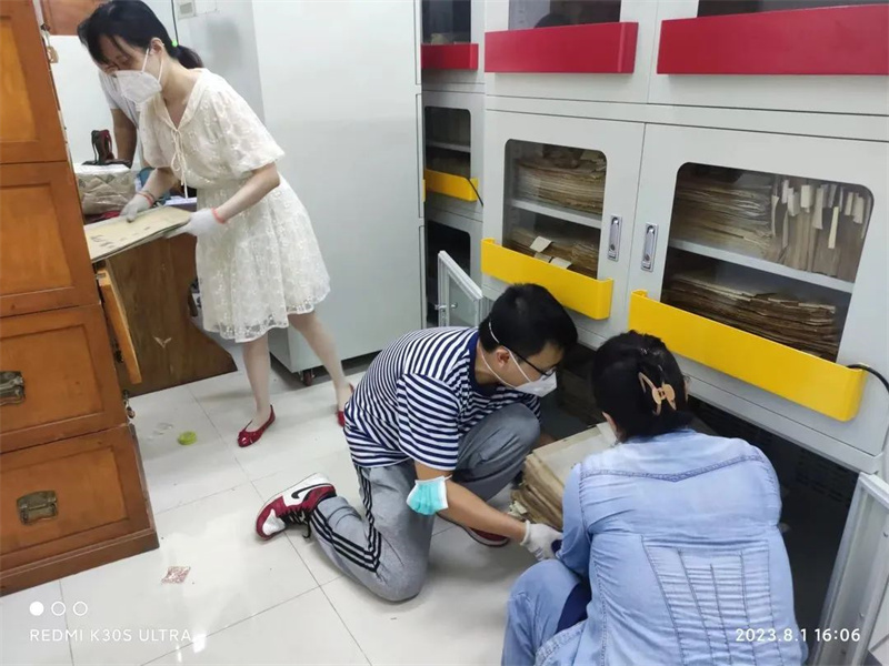 对此,馆领导高度重视,通过调剂配置了10台恒温恒湿储藏柜,极大地改善了部分民国时期文献的保管条件。在文物保护技术部、行政管理部等部门的大力支持帮助下,8月1日,图书资料部集中力量把库房里破损严重的老旧柜子去除,对历史文献资料进行除尘清理、分类编排后,重新放置到恒温恒湿储藏柜中。该设备具有极强的控温、控湿能力,它能使柜内温湿度恒定在一个固定的数值,不受外界环境影响,且防潮、防霉、防虫,是当前保存古籍和历史文献资料较为安全稳妥的专业用品。随着珍贵文献搬进“新家”,图书资料库房的面貌也焕然一新。